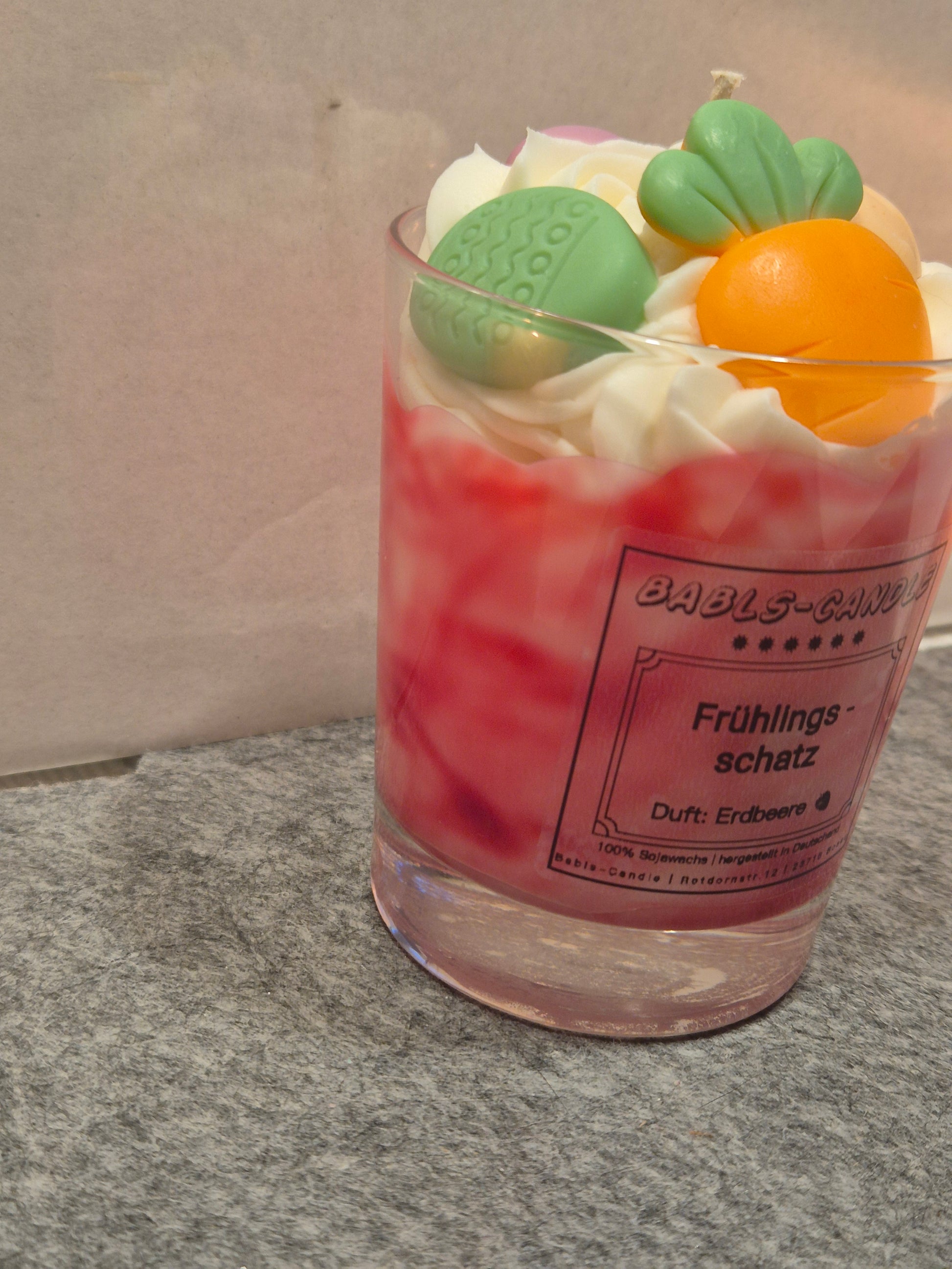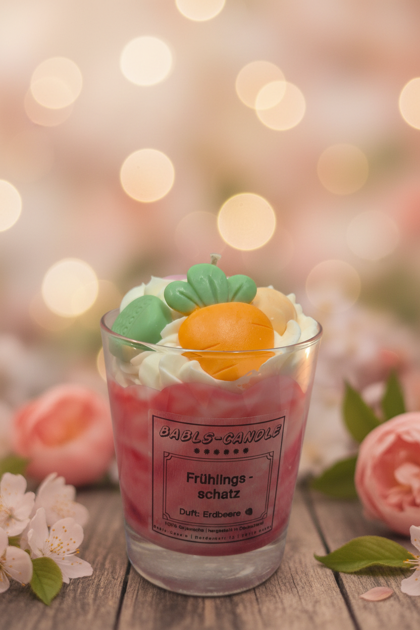 Entdecke "Frühlingsschatz" – eine handgegossene Duftkerze aus 100% natürlichem Sojawachs, die den verführerischen Duft sonnengereifter Erdbeeren in dein Zuhause bringt. Ein süßer Frühlingsgruß, der Gemütlichkeit und Lebensfreude vereint.
